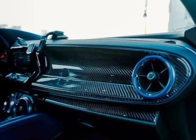 This carbon fiber interior Passenger Dashboard Overlay is made using real carbon fiber with a glossy finish.