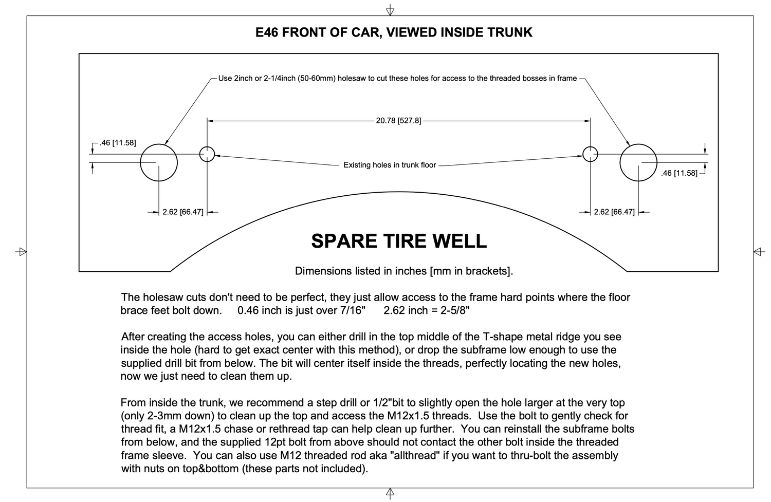 *E46 instructions are attached here as an image. On E36 you simply holesaw the two metal protrusions that are already on your floorboard and you are going to be in the right place versus E46 needing to measure.