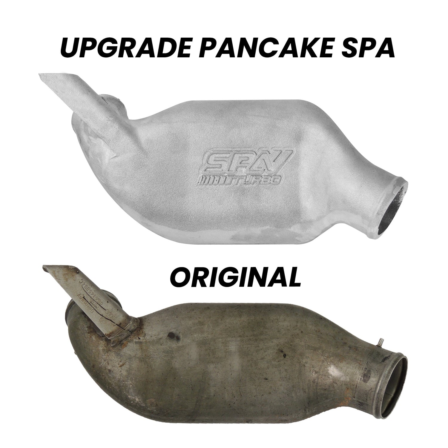 • This part replaces the stock flat one also known as Pancake (PN: 06A145894C), which passes in front of the motor pulleys. With the original tube design, there is a turbulence caused in the airflow by the restriction, the SPA Turbo pancake pipe eliminates this restriction without compromising the operation of other vehicle components.