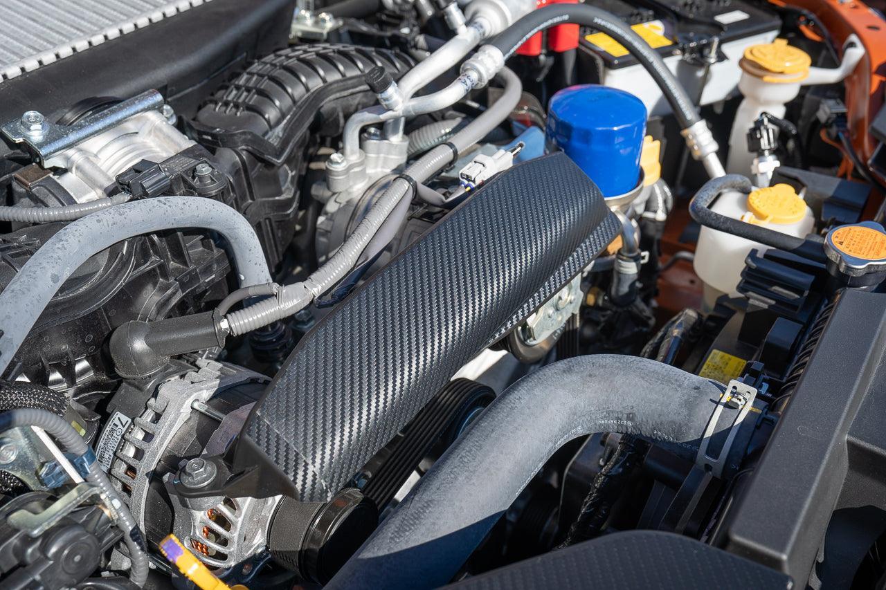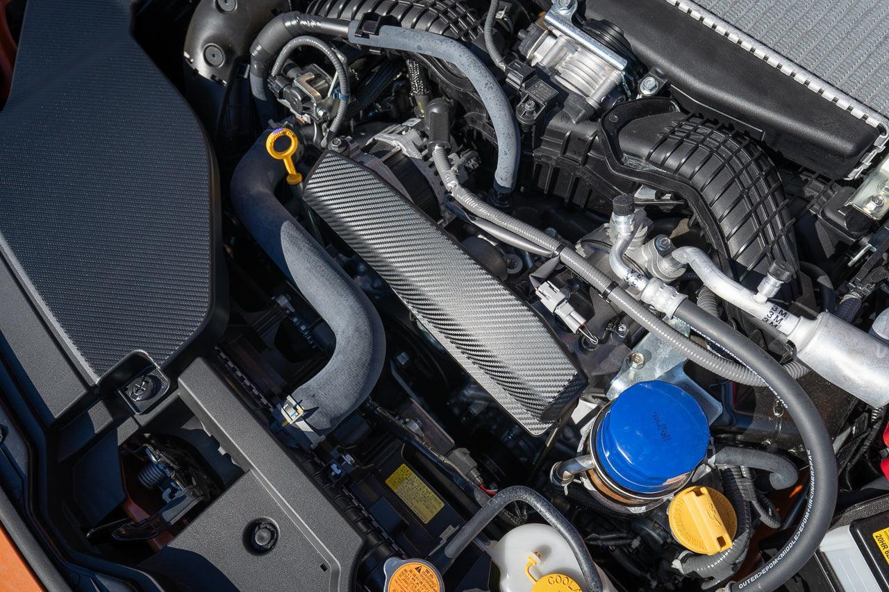 The plain plastics under the hood of the 2022+ WRX can use some subtle bling.  The ultra dark, textured 3D carbon that we use is reminiscent of the material Subaru uses in some of their JDM parts.