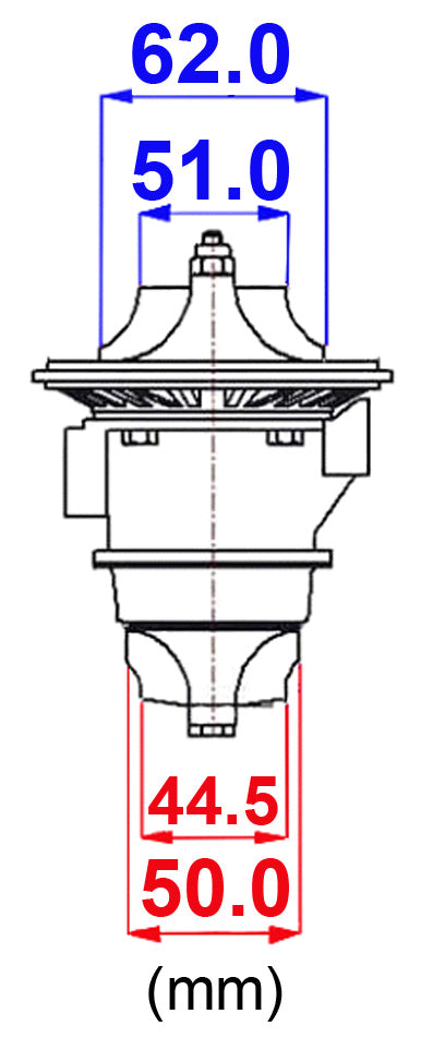 Compressor wheel: 51mm inlet diameter featuring extended tip design, providing a higher and optimized airflow compared to the stock one with a minimum mass increase. (Obs.: requires compressor housing machining to fit the bigger wheel).