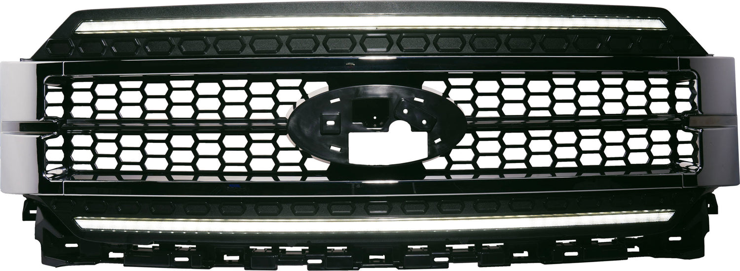 - Comprehensive grille assembly featuring integrated Daytime Running Light (DRL) light bars on both upper and lower sections.