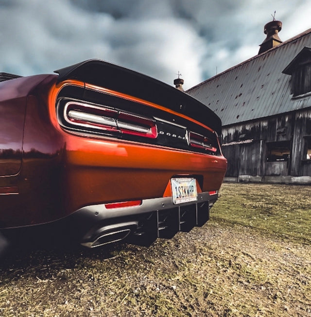 Our rear Challenger Stealth diffuser will fit all* 15-23 standard body models. This product is made of 1/4 and 3/8 HDPE and 14 gauge Aluminum.  This product ships with the main diffuser and two rear extensions making it a 3 piece install.