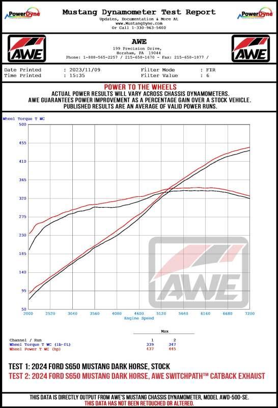 Introducing the AWE SwitchPath™ Cat Back Exhaust for the Ford S650 Mustang Dark Horse. This system retains all the customization of the factory active exhaust while unleashing the Dark Horse’s 5.0L engine with the push of a button or the drop of a hammer. Engineered for both sophistication and raw power, SwitchPath™ is valved for your comfort. It boasts a full 3” design with modular inlets, including slip fit adapters for seamless integration with factory headers and the option for a dual 3” connection for those seeking an even more aggressive setup. Thanks to tier-1 valving, drive modes, customized settings, and programmable buttons respond promptly to your commands. The precision H-pipe ensures a deep, rich muscle tone with minimal rasp, unlike an X-pipe. Additionally, straight-through bullet-style resonators in the mid pipes further minimize rasp, catering to drivers considering header upgrades. On the performance front, dyno-verified gains of +8 hp and +8 lb-ft of torque at the wheels. AWE's SwitchPath™ Cat Back is 100% emission-friendly, seamlessly integrating with factory emissions equipment. Completing the package are quad 5” slash-cut, double-walled tips, available in chrome silver or diamond black. Crafted in PA, USA, from US-sourced .065”-wall T304L stainless steel, every aspect is engineered, designed, and manufactured in-house at AWE. Backed by AWE's Lifetime Warranty, No CEL Light Guarantee, and Perfect Fitment Guarantee.