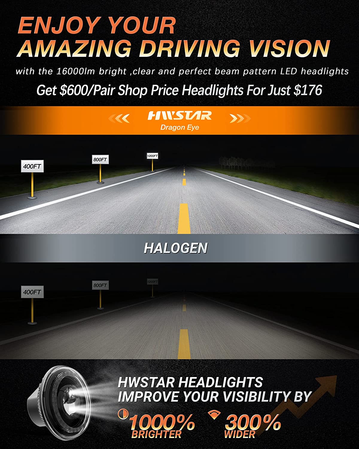 - Upgraded Headlights: Super Bright, 8000lm/4000lm High/Low Beam; the best beam pattern on the market: uniform light, no blind area and dim spots; heavy duty: 5lbs/pair; modern look, Plug & Play, IP67 waterproof