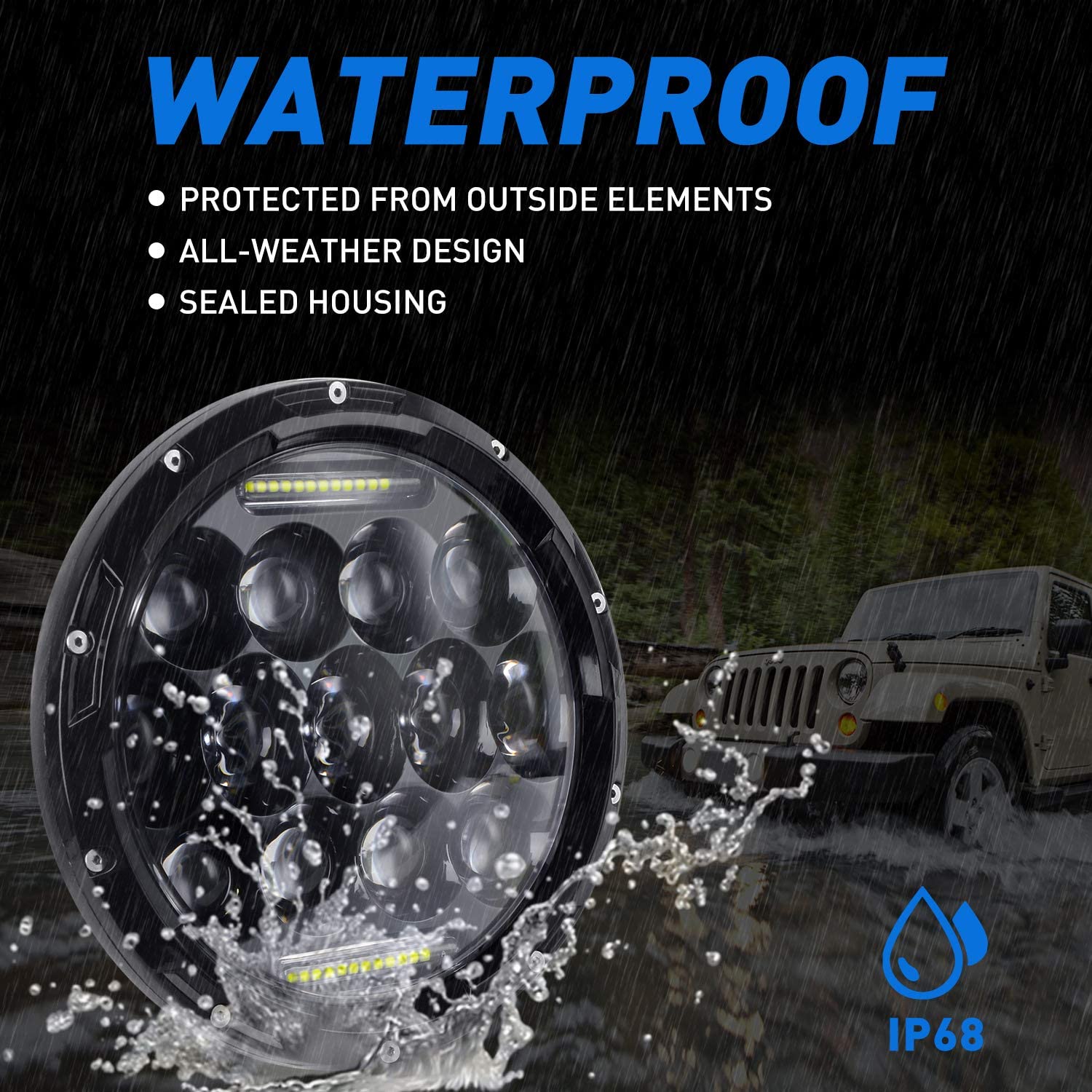 • High Performance TJ LED HeadLights: 75W 7 inch round LED headLights with 7500lm high beam and 5500lm low beam at 6000K for each headLight, above 5000 hours lifespan.