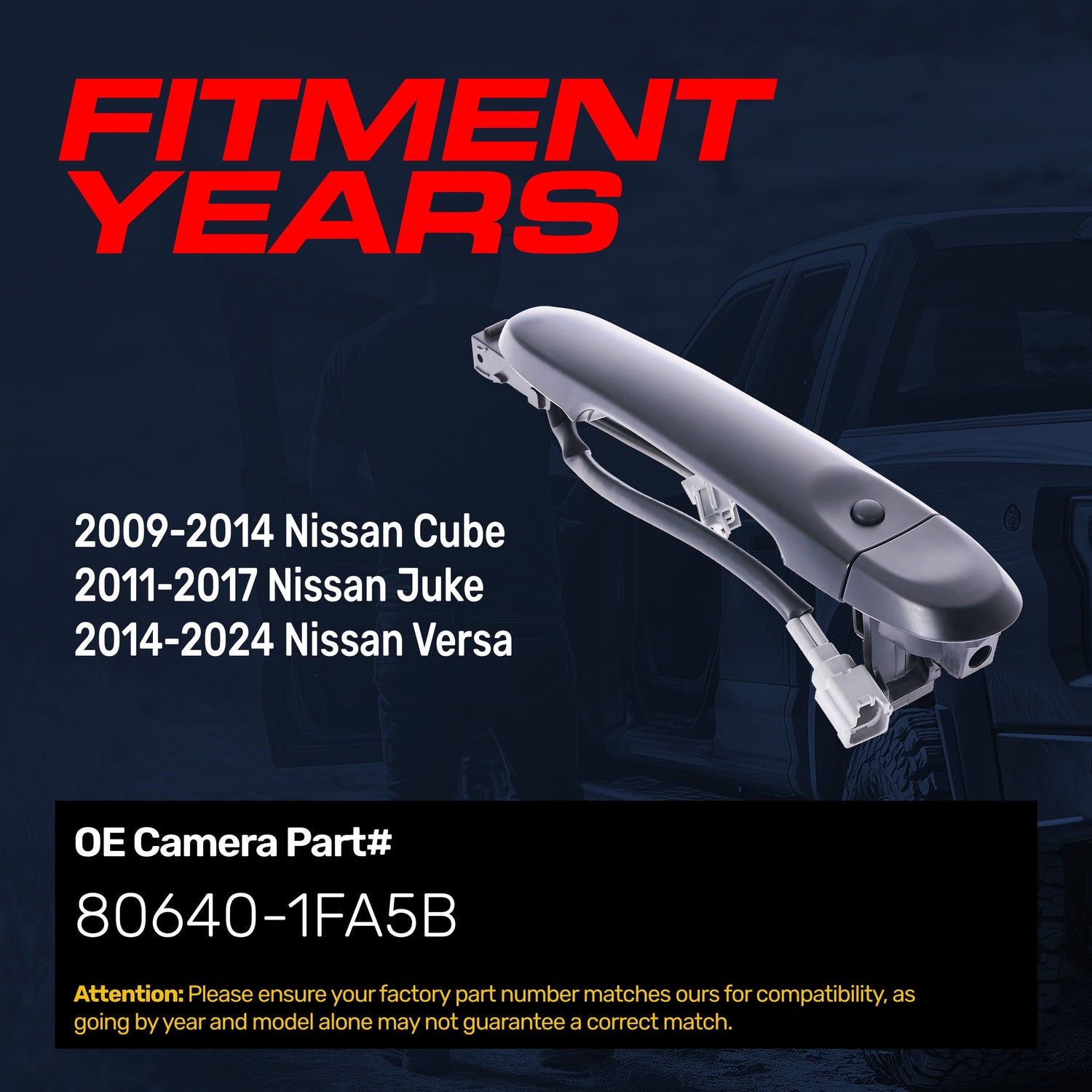 COMPATIBLE WITH: This door handle is specifically designed to be compatible for use with Nissan Cube (2009 2010 2011 2012 2013 2014), Nissan Juke (2011 2012 2013 2014 2015 2016 2017), Nissan Versa (2014 2015 2016 2017 2018 2019 2020 2021 2022 2023 2024).