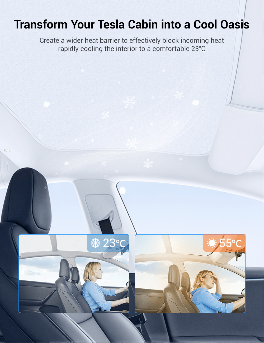 Our **dual-layer graphene** and innovative design deliver a noticeable temperature drop inside your Model 3, enhancing driving comfort and reducing energy consumption.